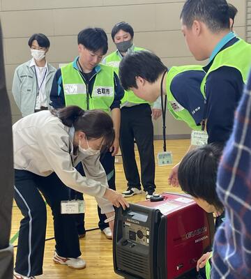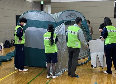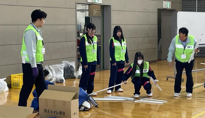 避難所開設訓練では、多目的トイレとパーティション、トイレ用テントと簡易トイレ、発電機と投光機を扱う3班に分かれ訓練を行いました。生徒も名取市防災安全課の方々とともに機材の使い方などを参加者にレクチャーしました。大人を前に堂々と使い方などを説明していました。