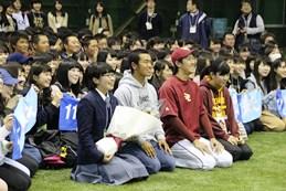 4月14日、楽天野球団からの招待を受け、本校OB岸孝之投手(22回生・平15卒)との対面、試合観戦を全校で行いました。岸選手からは「応援こそ力になります」と、応援が人を勇気づけることをお話しいただきました。