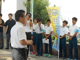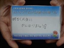 7月12日、志教育支援事業として増田中学校区の小中高が連携したあいさつ運動の第2回が行われました。山田司郎名取市長さんが激励においでいただきました。今回は、増田小、下増田小の児童の皆さんの書いた「ひとことメッセージ」を添えたティッシュを配りあいさつを呼び掛けました。