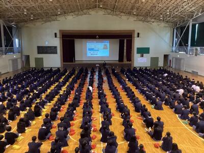 新型コロナの影響で、昨年度まではオンラインでの開催でしたが、新型コロナが落ち着いてきたので、今年度は体育館に全校生徒そろって開催されました。