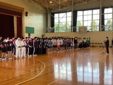 その後は、壮行会が行われ、インターハイ予選など3年生にとって最後の大会を控えた部活動の生徒たちにエールを送りました。